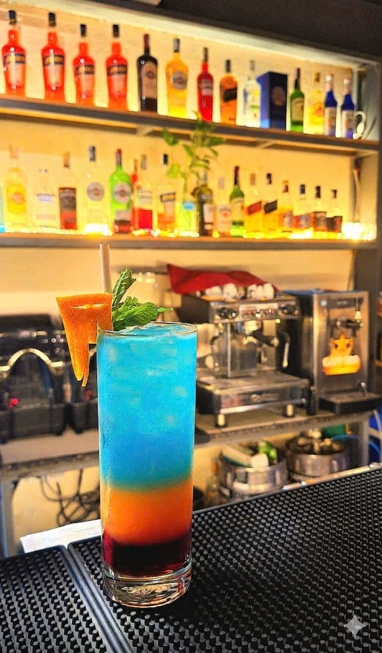 Rượu rum Bacardi nhẹ, curacao xanh, malibu, nước cam, nước cốt chanh, grenadine