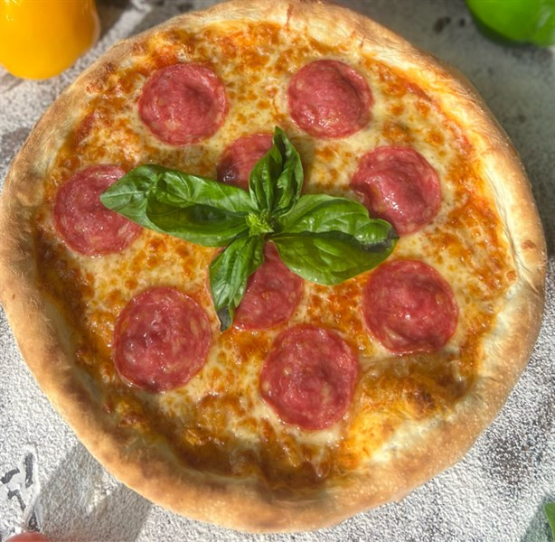 Pizza with Italian garlic sausage, Mozzarella cheese, olives & tomato sauce